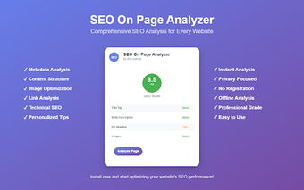 Bu eklenti, SEO uzmanları, dijital pazarlamacılar ve web geliştiricileri için idealdir. Kullanıcı dostu arayüzü sayesinde, kullanıcılar yalnızca eklenti simgesine tıklayarak anlık SEO analizi alabilirler. Tamamen çevrimdışı çalışan bu araç, kullanıcı verilerini harici sunuculara göndermeden güvenli bir analiz sunar. SEO puanınızı 1-10 arasında alarak, geliştirme alanlarınızı belirlemenize yardımcı olur.